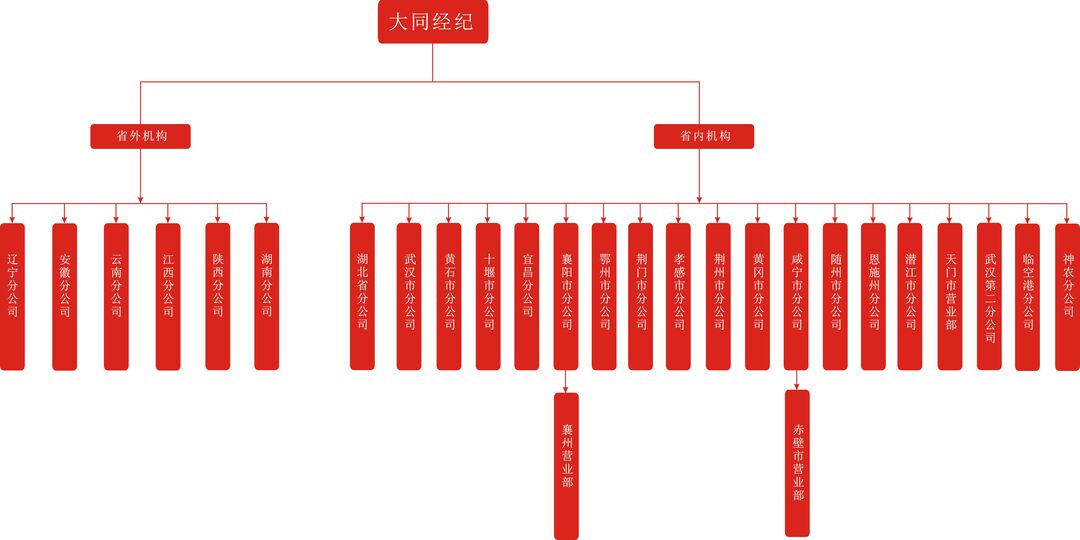 2014年,大同經(jīng)紀資產(chǎn)重組后,在省政府及各職能部門的全力支持下,高點起步,快速布局,在全省各市州設(shè)立了分支機構(gòu),形成了在全省范圍內(nèi)通行達業(yè)、通城達鎮(zhèn)、通鄉(xiāng)達村、通街達巷的城鄉(xiāng)經(jīng)紀服務(wù)網(wǎng)絡(luò)。我們已根植湖北并走向全國:下轄28家機構(gòu),其中湖北省內(nèi)分公司18家,省外分公司6家,省內(nèi)營業(yè)部 4 家。
